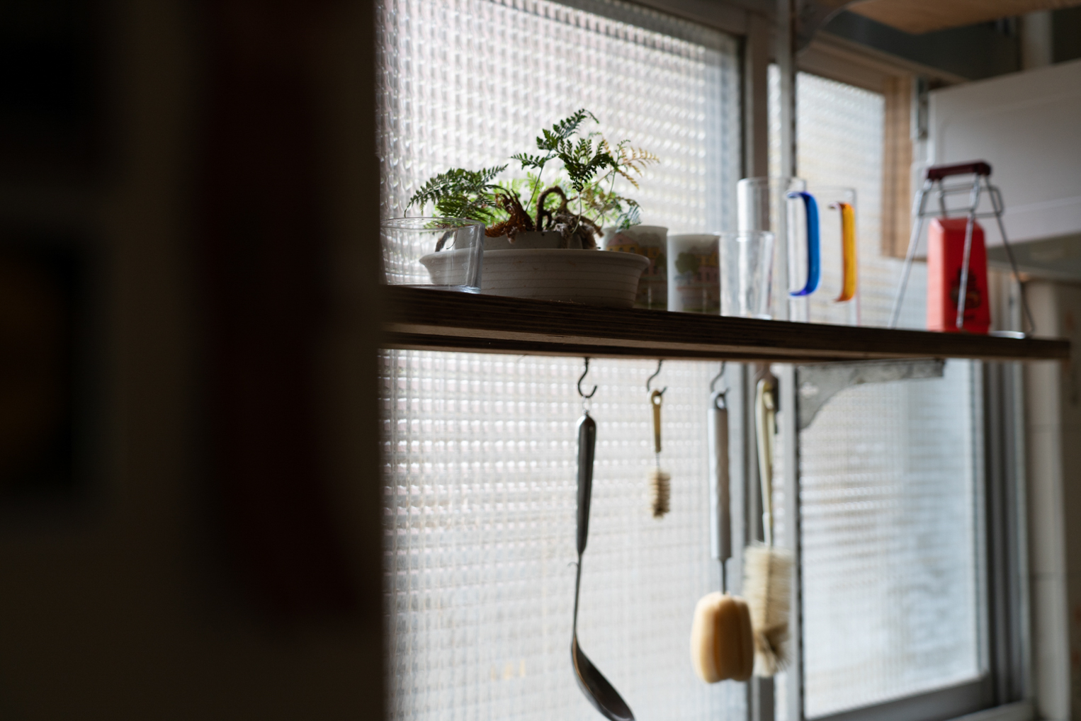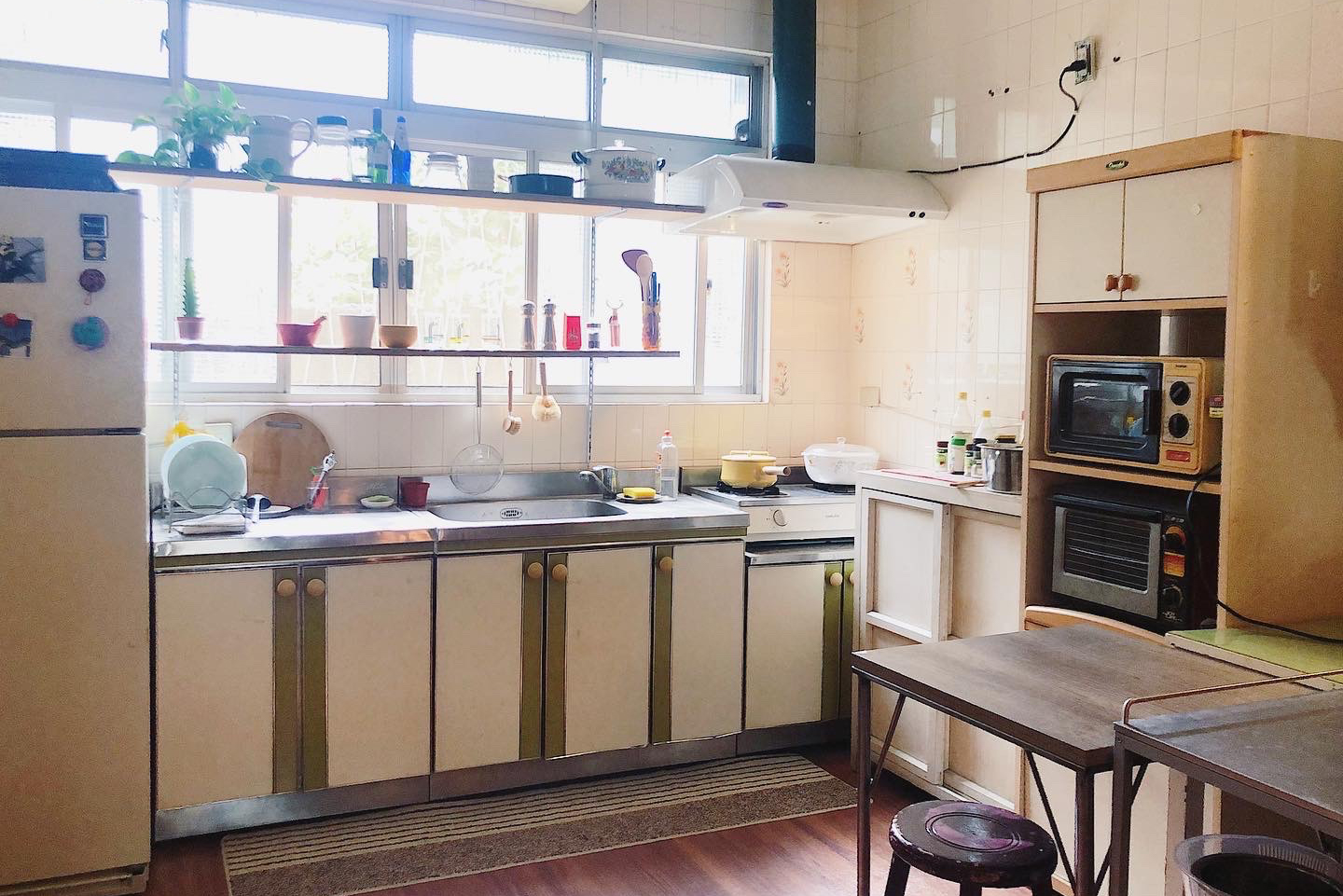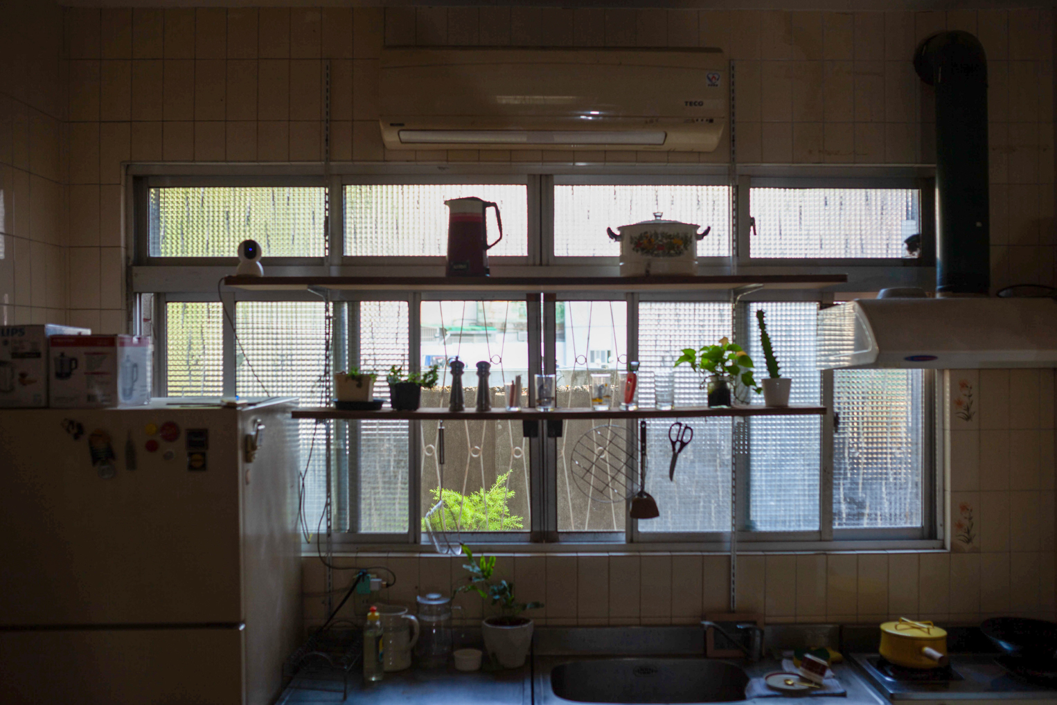 窗前擺放著各式鍋具及充滿滋味的調味料,記憶中在廚房裡忙碌的背影,是最熟悉的畫面,也是家的味道。