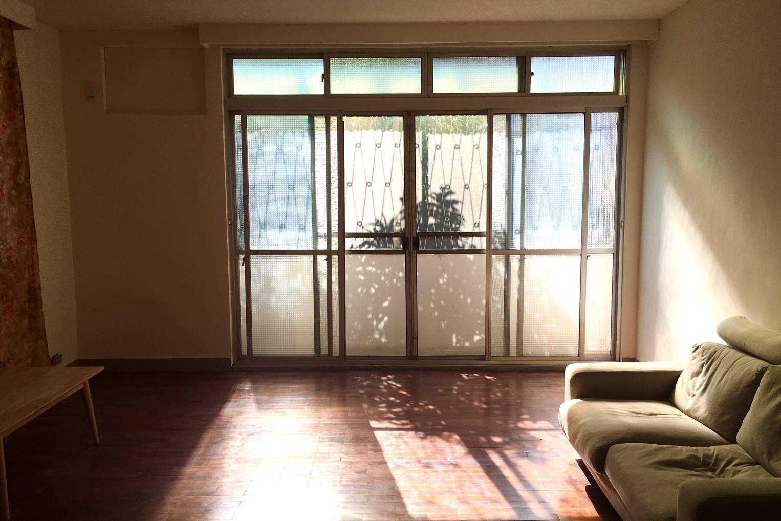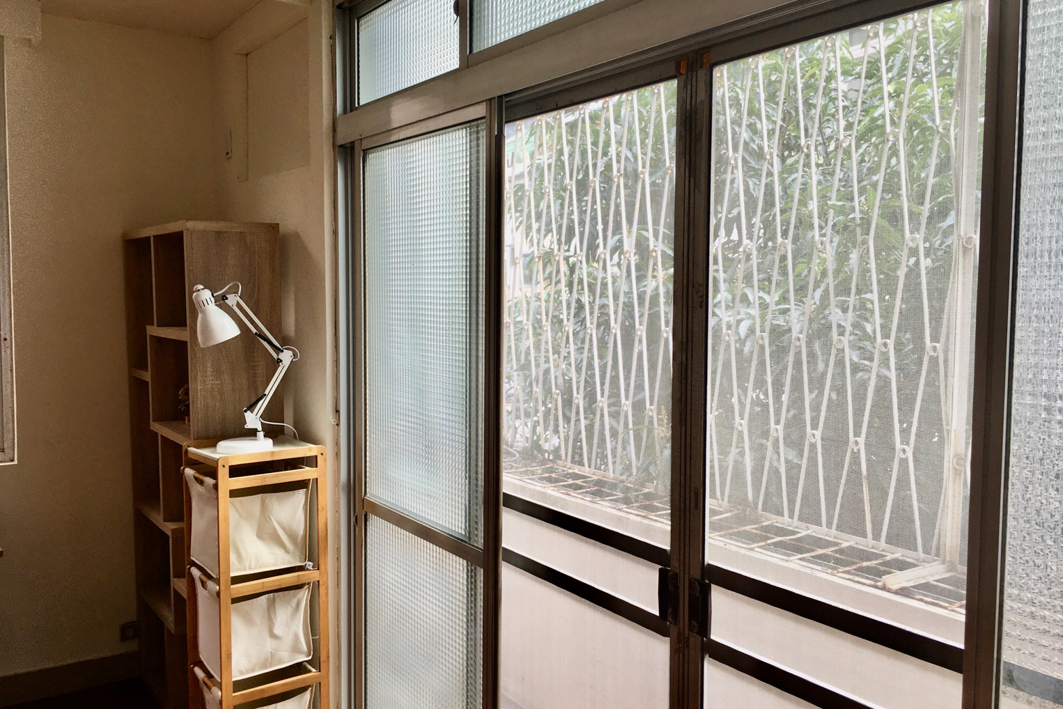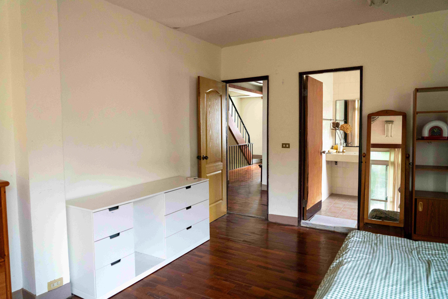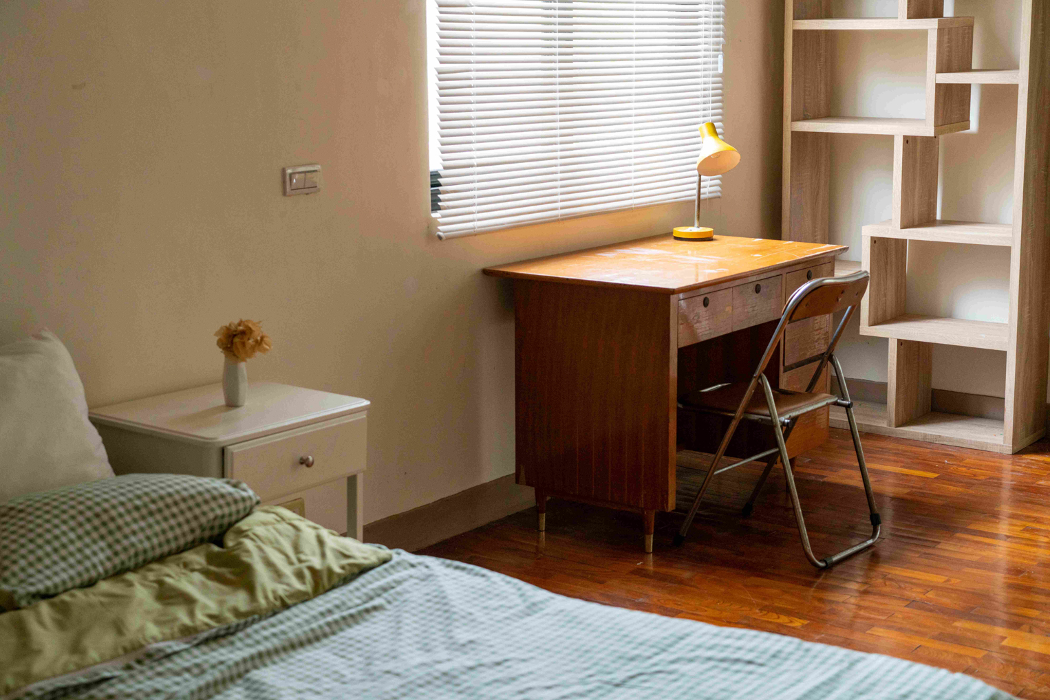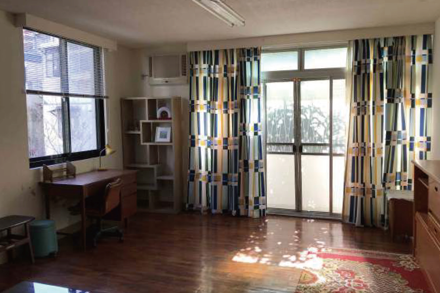 雙人床、書桌、櫃子等皆可做更換,獨立衛浴空間大有褐色小浴缸及大洗手台,通往陽台的窗門上有門簾,裝著鐵窗花陽台的可以通往隔壁房間